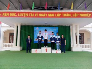 Thầy Mai Đình Nhường – Phó HT và thầy Vũ Mạnh Cường Tổ trưởng tổ GDTC-GDQP trao giải cho các em học sinh tại buổi chào cờ đầu tháng 12/2024
